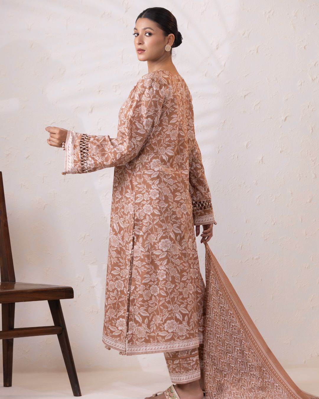 Details: A modern rotary-printed lawn set featuring a regular-fit long -kameez, classic cigarette pants, a soft lawn dupatta, and elegant stitching details on the sleeves.