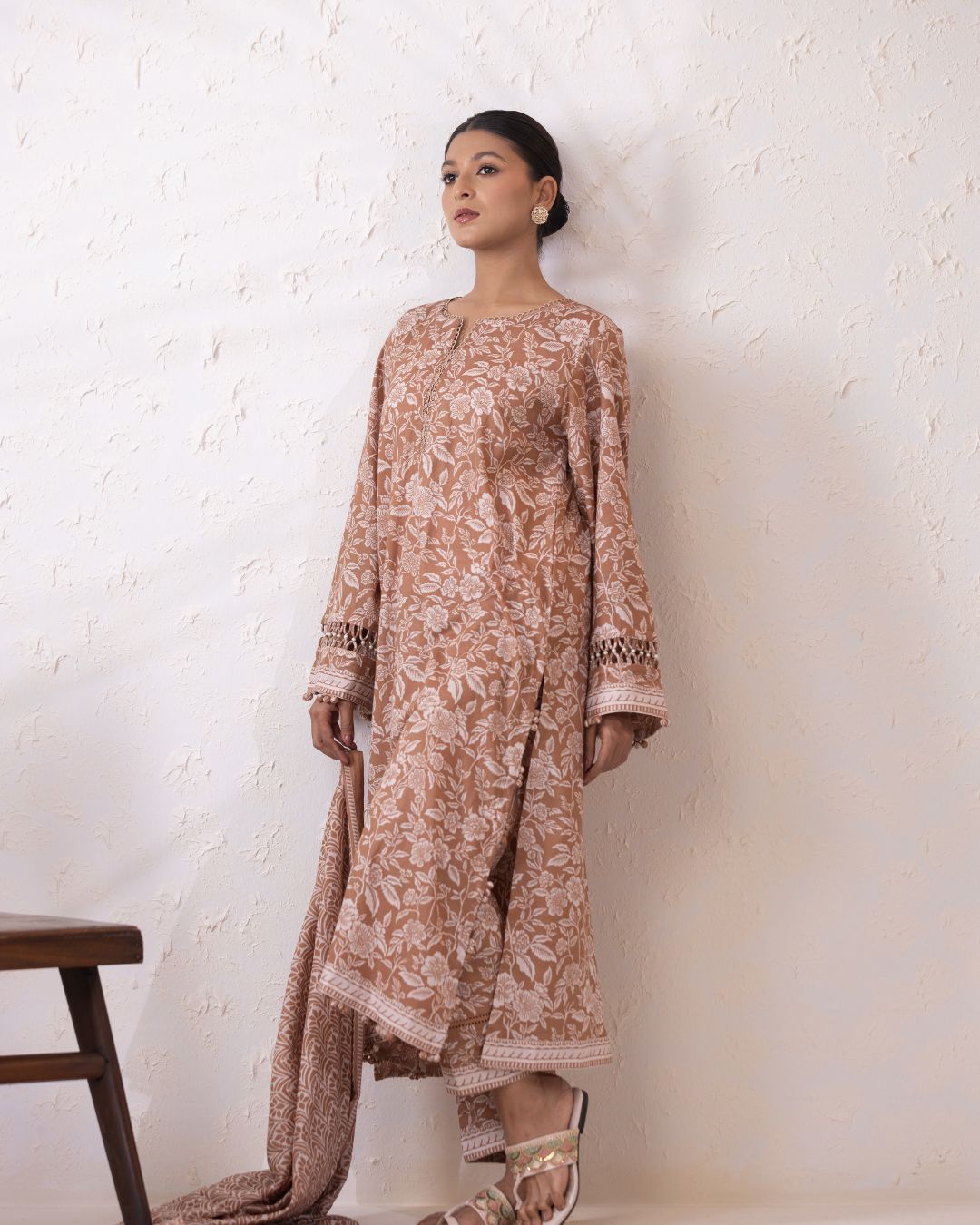 Details: A modern rotary-printed lawn set featuring a regular-fit long -kameez, classic cigarette pants, a soft lawn dupatta, and elegant stitching details on the sleeves.